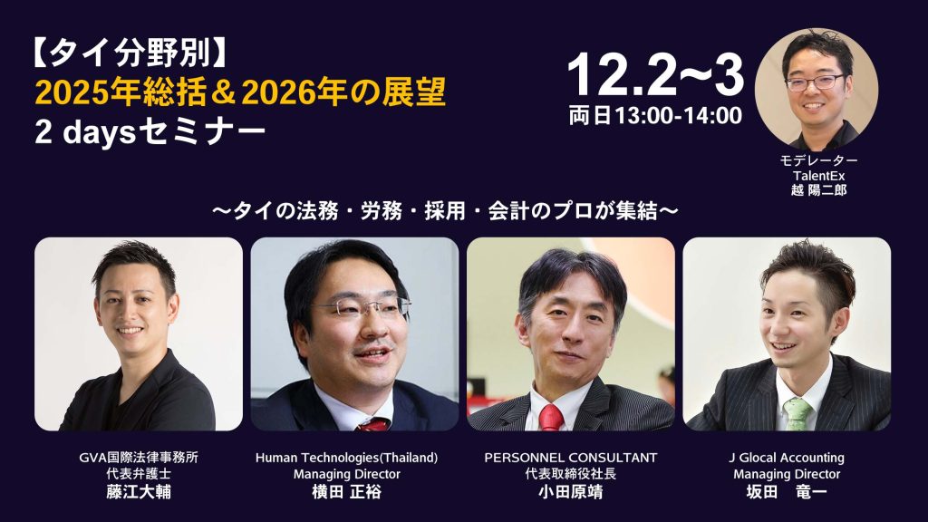 今回の【タイ分野別】2025年総括&2026年の展望 2 Daysセミナーでは、現地実務の第一線で企業支援を行う専門家が登壇し、